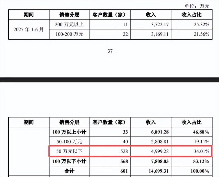 进一步来看,50万元以下客户占据主要地位,分别为547家、596家、664家、528家,公司主要客户类型系模具厂客户,分别为565家、565家、662家、514家,对应的收入分别为12,254.20万元、13,652.58万元、18,479.47万元、11,913.72万元,收入占比分别为85.95%、81.08%、78.82%和81.05%。
