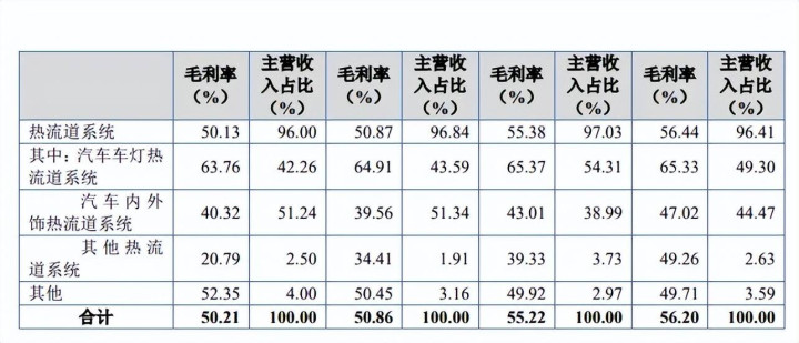 需要指出的是,主营业务毛利率呈现连续下滑态势,分别为56.2%、55.22%、50.86%、50.2%,热流道系统从56.44%下滑至50.13%,累计下滑6.31个百分点,其中汽车内外饰热流道系统从47.02%下滑至40.32%,累计下滑6.7个百分点;汽车车灯热流道系统从65.33%下滑至63.76%,累计下滑1.57个百分点。