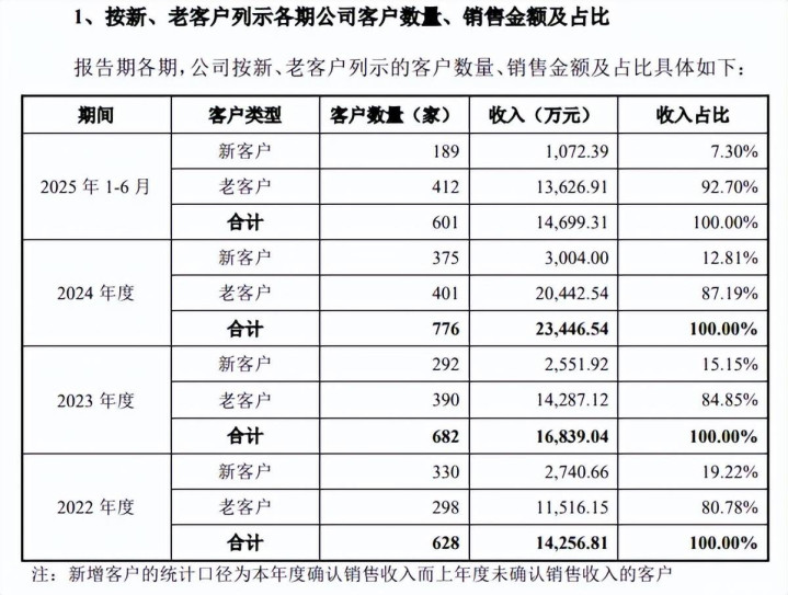 报告期内,公司客户数量分别为628家、682家、776家和601家,呈现先增后降态势,其中老客户收入占比分别为80.78%、84.85%、87.19%、92.70%,总体较为稳定。新增客户对收入的贡献分别为19.22%、15.15%、12.81%、7.30%,总体贡献较为有限。
