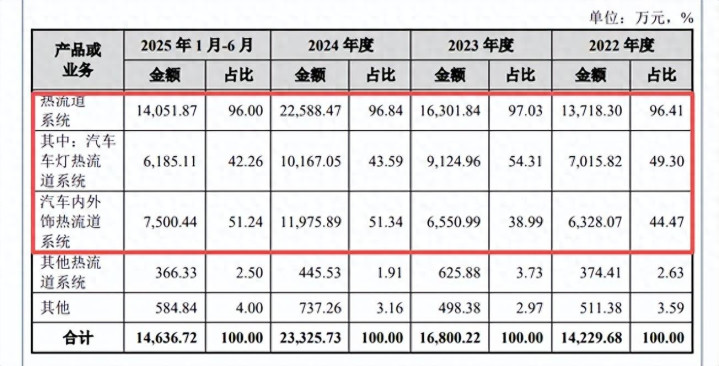主营业务毛利率连降。恒道科技主营业务基本由热流道系统贡献,期末收入、占比分别为1.41亿元、96%,主要包括汽车车灯热流道系统以及汽车内外饰热流道系统,前者报告期收入分别为0.7亿元、0.91亿元、1.02亿元、0.62亿元,收入占比从49.3%下滑至42.26%;后者收入分别为0.63亿元、0.66亿元、1.2亿元、0.75亿元,占比从44.47%上升至51.24%。