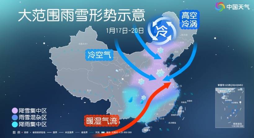 中央气象台预计,17日至21日,西北地区东部、华北南部、黄淮、江汉、江淮西部、江南北部等地有中到大雪或雨夹雪,陕西南部、山西南部、河南、山东西部和半岛地区、湖北中西部、湖南北部、安徽等地部分地区有暴雪;上述地区新增积雪深度3~8厘米,陕西南部、河南西部、湖北西北部等地部分地区10厘米左右,局地可达15厘米以上;主要降雪时段为19日至20日。19日至21日,河南西部、湖北西部、湖南、贵州、重庆东部等地部分地区有冻雨。